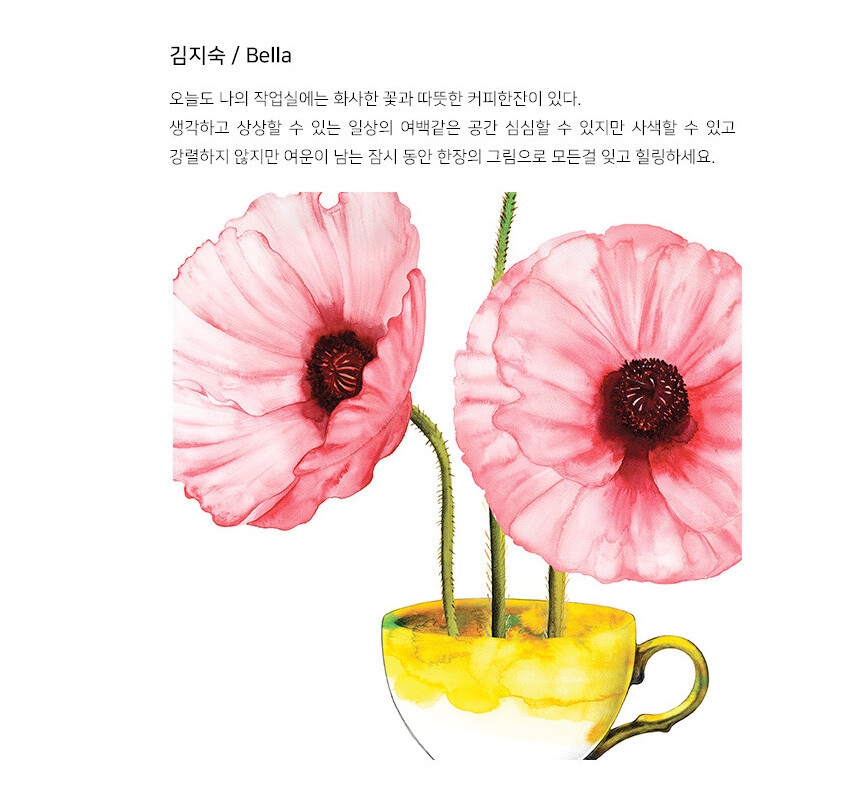 커피 디자이너 벨라. 다양한 커피 패키지 디자인, 일러스트 디자이너로 활동하던 그녀가 본인의 작품을 세상에 선보입니다. 꽃의 의미와 커피 추출기구의 의미를 함께 전달하는 그녀의 작품을 콜렉션 하세요. 진한 커피 향의 여운이 언제나 그 공간에 함께 할거에요.