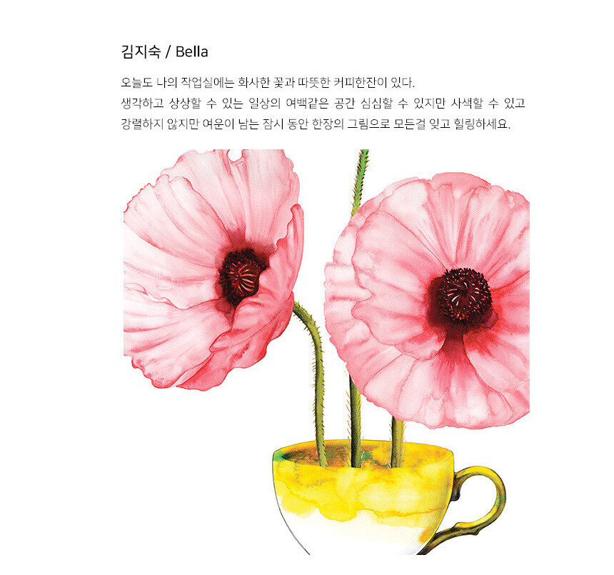 커피 디자이너 벨라. 다양한 커피 패키지 디자인, 일러스트 디자이너로 활동하던 그녀가 본인의 작품을 세상에 선보입니다. 꽃의 의미와 커피 추출기구의 의미를 함께 전달하는 그녀의 작품을 콜렉션 하세요. 진한 커피 향의 여운이 언제나 그 공간에 함께 할거에요.