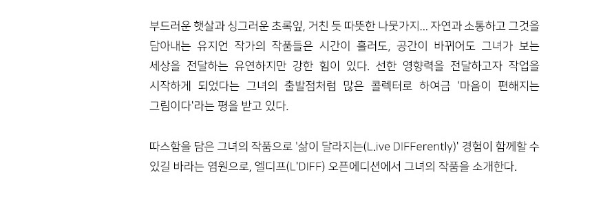 부드러운 햇살과 싱그러운 초록잎, 거친 듯 따뜻한 나뭇가지... 자연과 소통하고 그것을 담아내는 유지언 작가의 작품들은 시간이 흘러도, 공간이 바뀌어도 그녀가 보는 세상을 전달하는 유연하지만 강한 힘이 있다. 선한 영향력을 전달하고자 작업을 시작하게 되었다는 그녀의 출발점처럼 많은 콜렉터로 하여금 '마음이 편해지는 그림이다'라는 평을 받고 있다. 따스함을 담은 그녀의 작품으로 '삶이 달라지는(L.ive DIFFerently)' 경험이 함께할 수 있길 바라는 염원으로, 엘디프(L'DIFF) 오픈에디션에서 그녀의 작품을 소개한다.