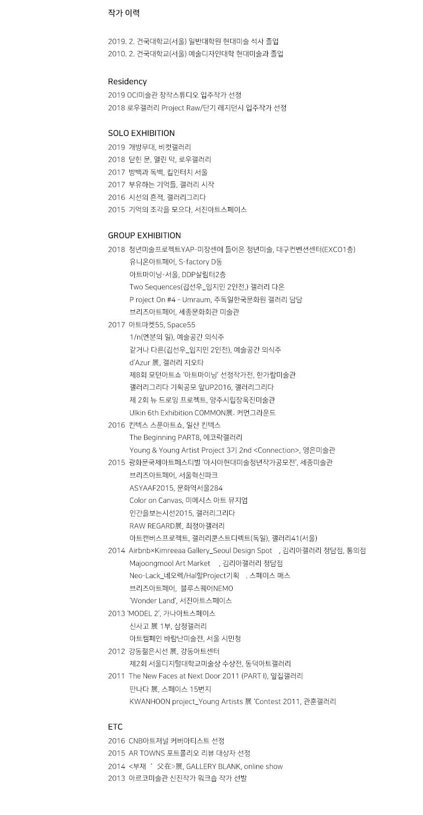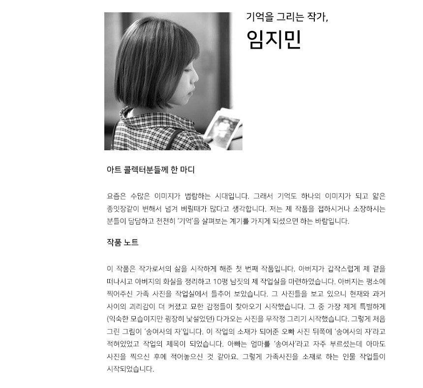 아버지가 갑작스럽게 제 곁을 떠나시고 아버지의 화실을 정리하고 10평남짓의 작은 제 작업실을 마련하였습니다. 아버지는 평소에 가족 사진을 많이 찍어주셨고 저는 작업실에서 그 사진들을 들추어 보았습니다. 그 사진들을 보고 있으니 현재와 과거 사이에서의 괴리감이 더욱 커졌고 묘한 감정들이 찾아오기 시작했습니다. 그 중 가장 제게 특별하게(익숙한 모습이지만 굉장히 낯설었던) 다가오는 사진을 무작정 그리기 시작했습니다.