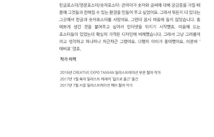 여러가지 포스터를 사보았지만 더 예쁜 포스터를 만들어주고 싶었다는 아빠. 아이 방에는 예쁜 것만 놓고 싶은 마음은 엄마나 아빠나 같은가봅니다. 하나하나 차근차근 그린 ‘애비표’ 포스터!