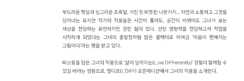 부드러운 햇살과 싱그러운 초록잎, 거친 듯 따뜻한 나뭇가지... 자연과 소통하고 그것을 담아내는 유지언 작가의 작품들은 시간이 흘러도, 공간이 바뀌어도 그녀가 보는 세상을 전달하는 유연하지만 강한 힘이 있다. 선한 영향력을 전달하고자 작업을 시작하게 되었다는 그녀의 출발점처럼 많은 콜렉터로 하여금 '마음이 편해지는 그림이다'라는 평을 받고 있다. 따스함을 담은 그녀의 작품으로 '삶이 달라지는(L.ive DIFFerently)' 경험이 함께할 수 있길 바라는 염원으로, 엘디프(L'DIFF) 오픈에디션에서 그녀의 작품을 소개한다.
