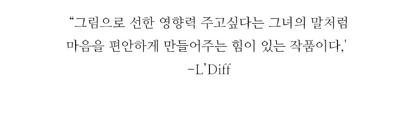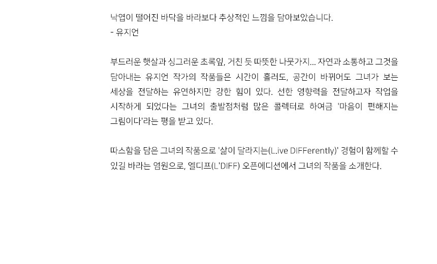 부드러운 햇살과 싱그러운 초록잎, 거친 듯 따뜻한 나뭇가지... 자연과 소통하고 그것을 담아내는 유지언 작가의 작품들은 시간이 흘러도, 공간이 바뀌어도 그녀가 보는 세상을 전달하는 유연하지만 강한 힘이 있다. 선한 영향력을 전달하고자 작업을 시작하게 되었다는 그녀의 출발점처럼 많은 콜렉터로 하여금 '마음이 편해지는 그림이다'라는 평을 받고 있다. 따스함을 담은 그녀의 작품으로 '삶이 달라지는(L.ive DIFFerently)' 경험이 함께할 수 있길 바라는 염원으로, 엘디프(L'DIFF) 오픈에디션에서 그녀의 작품을 소개한다.